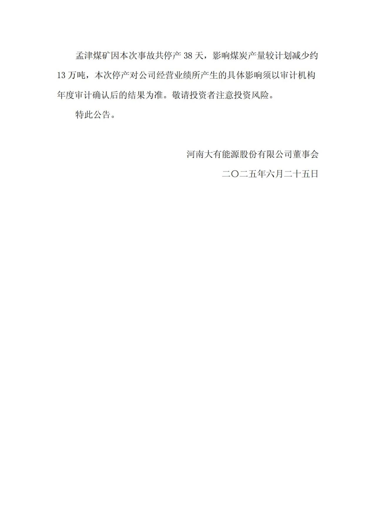 2025年5月15日,大有能源全資子公司義馬煤業(yè)集團(tuán)孟津煤礦有限責(zé)任公司(以下簡稱“孟津煤礦”)因發(fā)生一起事故而停產(chǎn)。孟津煤礦因本次事故共停產(chǎn)38天,影響煤炭產(chǎn)量較計劃減少約13萬噸。