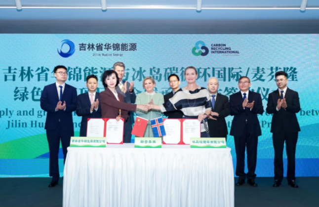 10月16日,正值冰島總統哈德拉?托馬斯多蒂爾訪華期間,2025可持續全球領導者大會在上海召開,大會主題活動——中國-冰島企業合作簽約儀式同期舉行,冰島總統哈德拉?托馬斯多蒂爾親臨現場。會上,吉林省華錦能源有限公司與冰島碳循環國際(CRI)/麥芬隆完成綠色甲醇項目暨全球承購合作簽約;中環新能源控股集團旗下中環新能源創新研究院有限公司,與吉林省華錦能源有限公司簽署戰略合作協議。