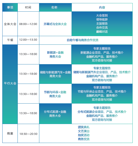 打破常規,創新融合,是“能金會”一大特色。資料顯示,第二界“能金會”共分三大板塊,一是“開幕式與全體大會”,二是“平行大會”,三是“晚宴”,主題清晰、層次分明,而不失“有料”、“有溫度”。其中,“平行大會”分為“新能源+金融商務大會”、“儲能與新能源汽車+金融商務大會”、“節能與環保+金融商務大會”和“分布式能源+金融商務大會”四個單元,每個單元分別設置了專家主題報告、相關企業項目、產品技術推介、金融機構產品、服務推介、和雙方咨詢與對接等環節,將能源與金融業之間的無縫對接落到了實處。